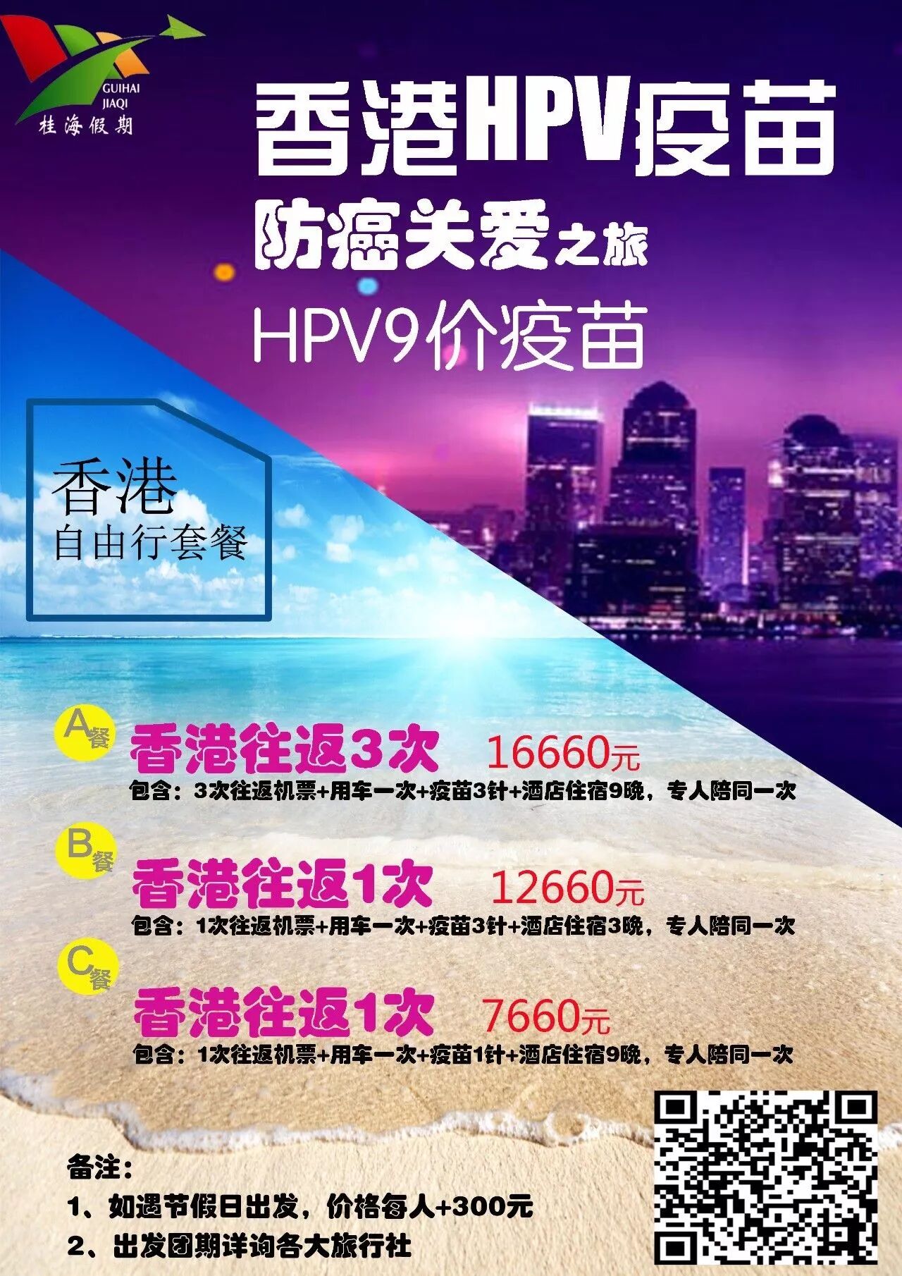 3次往返机票+用车1次+医港通防癌之旅疫苗3针+酒店住宿9晚,专人陪同一次16660元/人