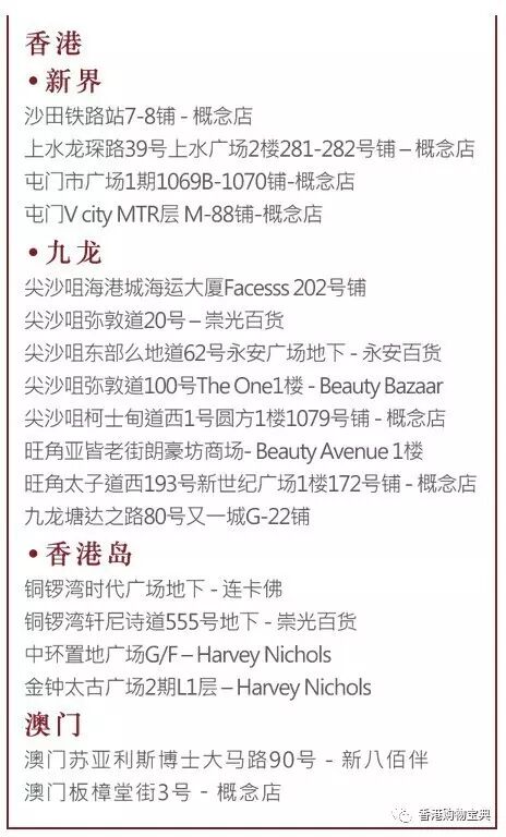 莎莎 | 万宁 | 屈臣氏 | 卓悦 | 雅施 | 卡莱美 | 崇光 | 一田百货 | 海港城 | 正生 | 楼上 | 华润堂 |...