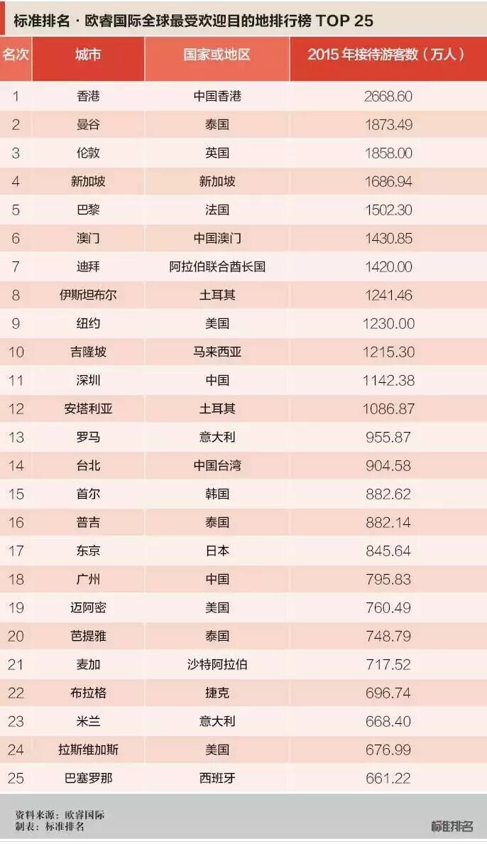 中国内地共有5个城市上榜,按游客数量排名依次是深圳、广州、上海、北京和珠海,全球排名分别是第11、第18、第26、第44和第63位。其中,深圳接待游客1142万人,广州796万人,上海654万人,北京420万人,珠海308万人。