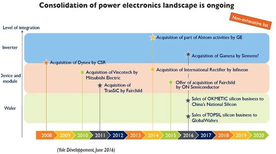 市场上功率电子企业纷纷采取大举投资研发、产品多元化以及收购等策略。由于新能源汽车产业是国家级的战略选择,中国半导体不仅在芯片领域投资方兴未艾,在功率电子这种新能源汽车产业关键部件开发方面的态度尤其积极(目前中国囊括了全球IGBT市场的三分之一以上),不遗余力地大举投资,试图掌握附加价值以及掌控整个功率电子器件的制造链。2016年,有两家中国企业收购了欧洲晶圆制造商,中国聘请了大量专家,同时自己建立本土晶圆厂试图在本地制造功率组件。
