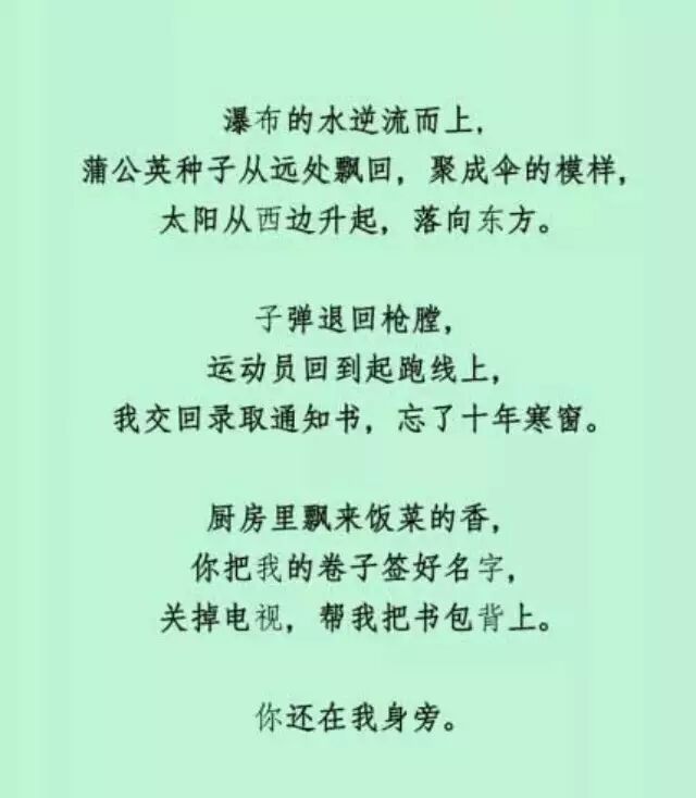 这是香港中文大学《独立时代》杂志,微情书征文大赛一等奖作品——《你还在我身旁》。这首诗,是一名不知名的作者写给已逝的母亲,用来缅怀对她的思念。作者希望时间能够倒流,一切的一切都能回到母亲在世的模样。假如,瀑布的水可以逆流而上,我能变回十年前的模样,母亲还能慈祥的陪伴在我身旁,可是,一切只是假如...