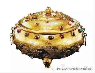 2008年4月11日,在香港苏富比“帝廷金辉——珍贵明清御制金器”专场上,一只明宣德金胎錾“赶珠云龙”纹嵌宝石三足盖炉以约1.17亿港元成交。该器物腹径18.6厘米,炉腹和盖面各錾刻有五爪游龙纹饰,在其金胎上并嵌有红、蓝宝石及珍珠。
