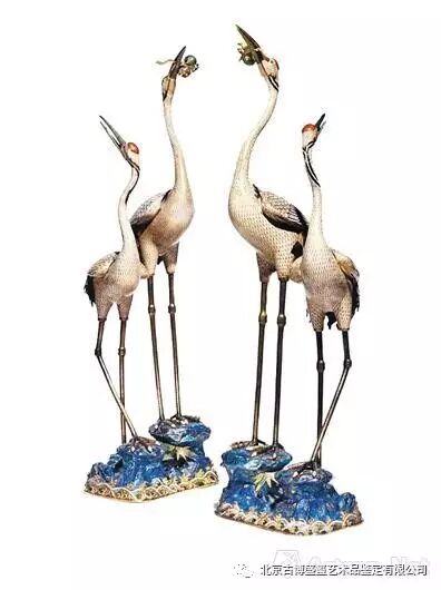 2010年12月2日,在香港佳士得“鹤鸣九皋——放山居御制珍品”专场上,一对清雍正御制掐丝珐琅双鹤香炉以约1.3亿港元成交。这对香炉高145厘米,形态为一对鹤作步行状,回首相望。鹤身中空,嵌白色釉,背施一条状蓝釉,以掐丝作羽纹,鹤嘴施墨绿釉,红顶。翅膀可开合,为盖。底座蓝釉錾胎珐琅为石,底绿、白掐丝珐琅饰浪花。