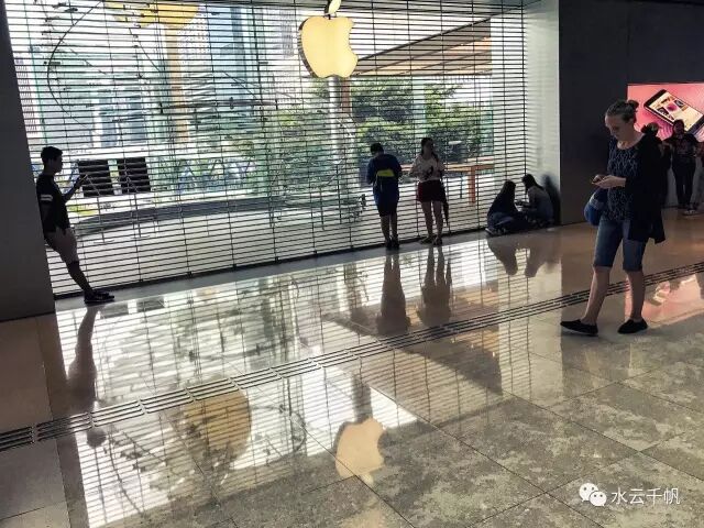 2017年7月23日,热带风暴“洛克“袭港期间,8号”风球“挂起,在中环苹果店门外等待“落波”的人们。