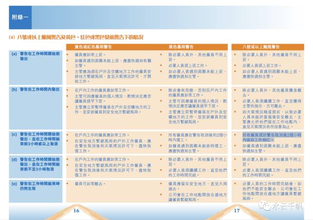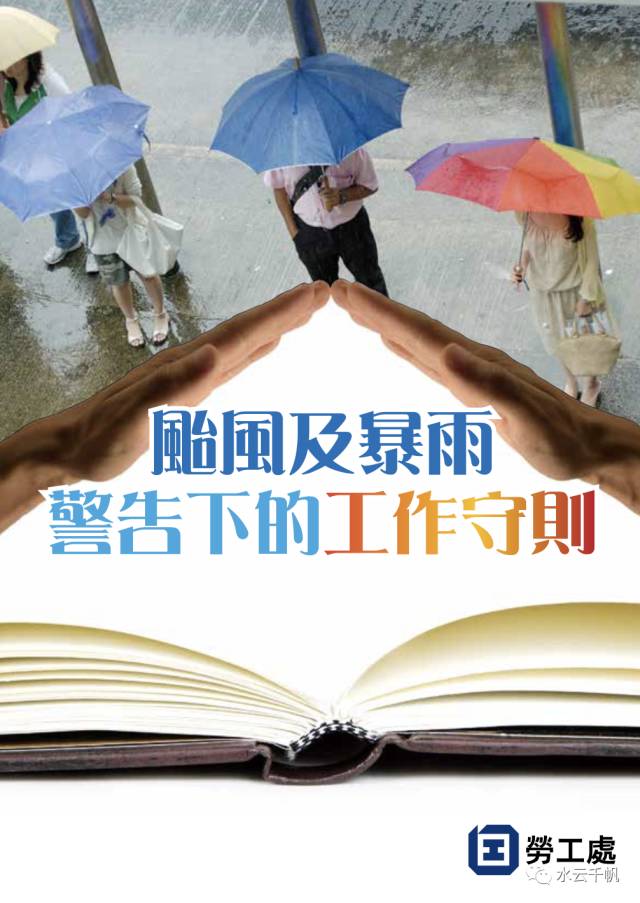 《香港劳工处台风及暴雨警告下的劳动守则》详尽列出了台风和暴雨天气,上班族最关心的事情,包括是否上班,提早下班,以及何时復工,还有工資計算的方法等等。