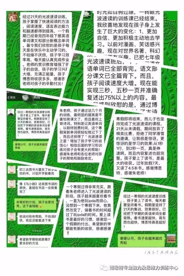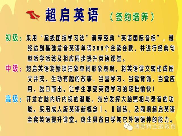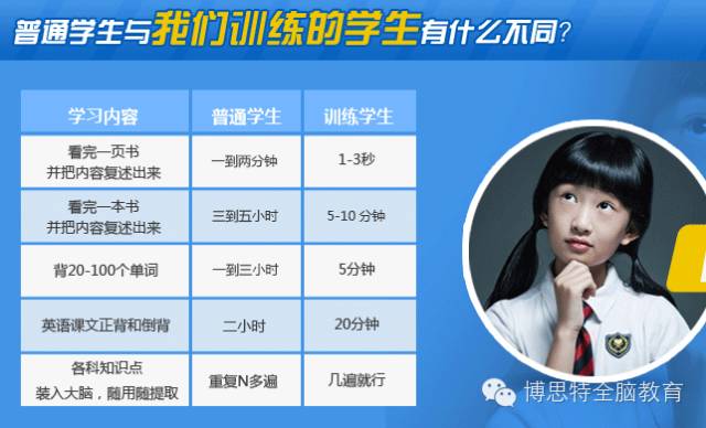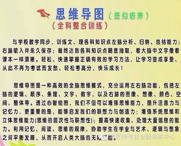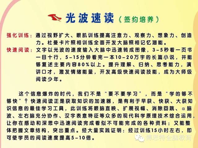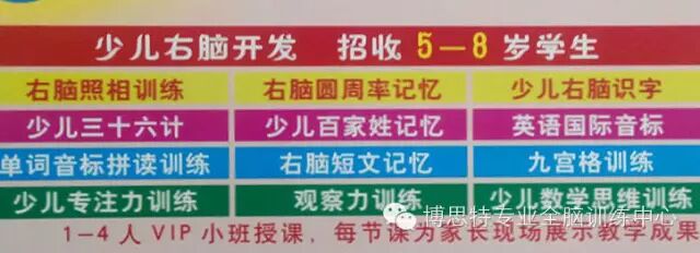 本机构的宗旨:还给孩子一个快乐轻松的童年,拥有终身受益的习惯,10分钟看完10万字小说, 5分钟会背20-100个英语单词,正背倒背新概念课文,轻松学习,快乐进步。获得广大家长的大力认可,真正做到签约培养过目不忘天才少年。