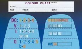 图表的后面有强白光、乳光、和特征的分类,每一维度与年龄相关联,每一生物型提示色彩与色彩饱和度的常见维度,要确定的第一个色维度是基本色度(BC),得自牙本质色度的平均值,应该通过用分层填充的同一复合材料的比色板在牙齿的中三分之一比色来确定。在图表左侧记录基本色度,所需的牙本质复合材料记录在右侧。牙本质的形状和乳突轮廓也需要确定并重现。