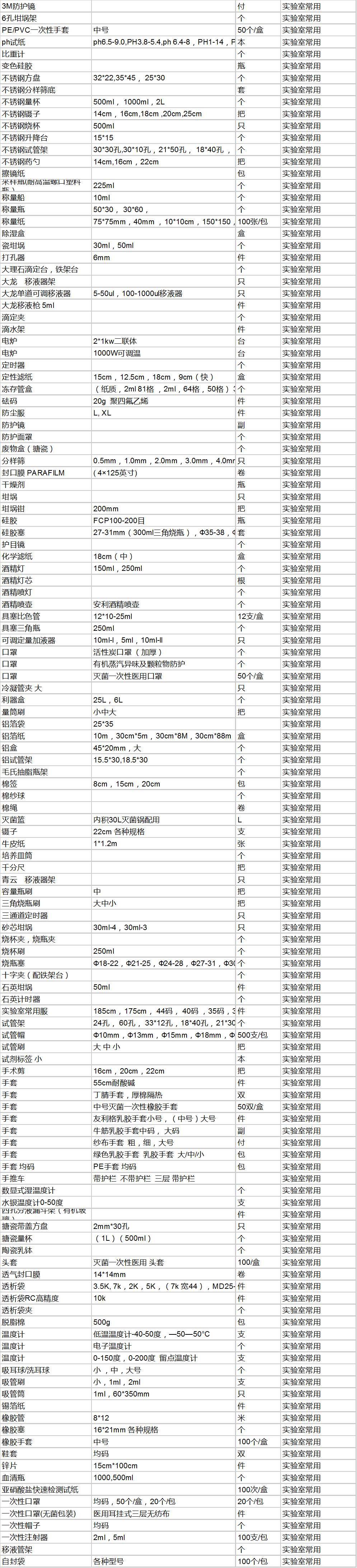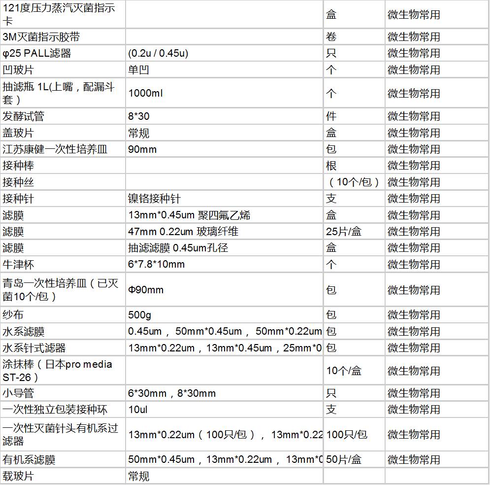 在实验室耗材虽然不是主题,但是却不可或缺!实验室需要用的实验耗材众多,琳琅满目,所需要采购的东西也很难一步到齐,这里列出了平常实验室(微生物实验室为例)常用的耗材目录,以供参考。