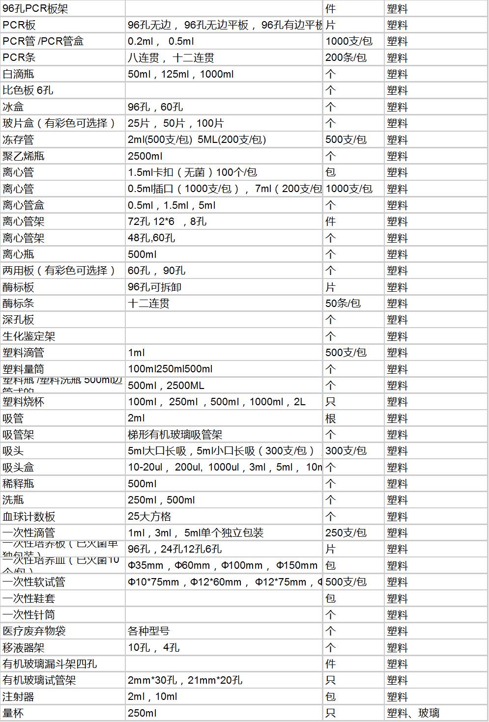 实验室耗材包括试剂类耗材和非试剂类耗材。下面主要列举非试剂类耗材。如有疏漏,还请在文底补充。