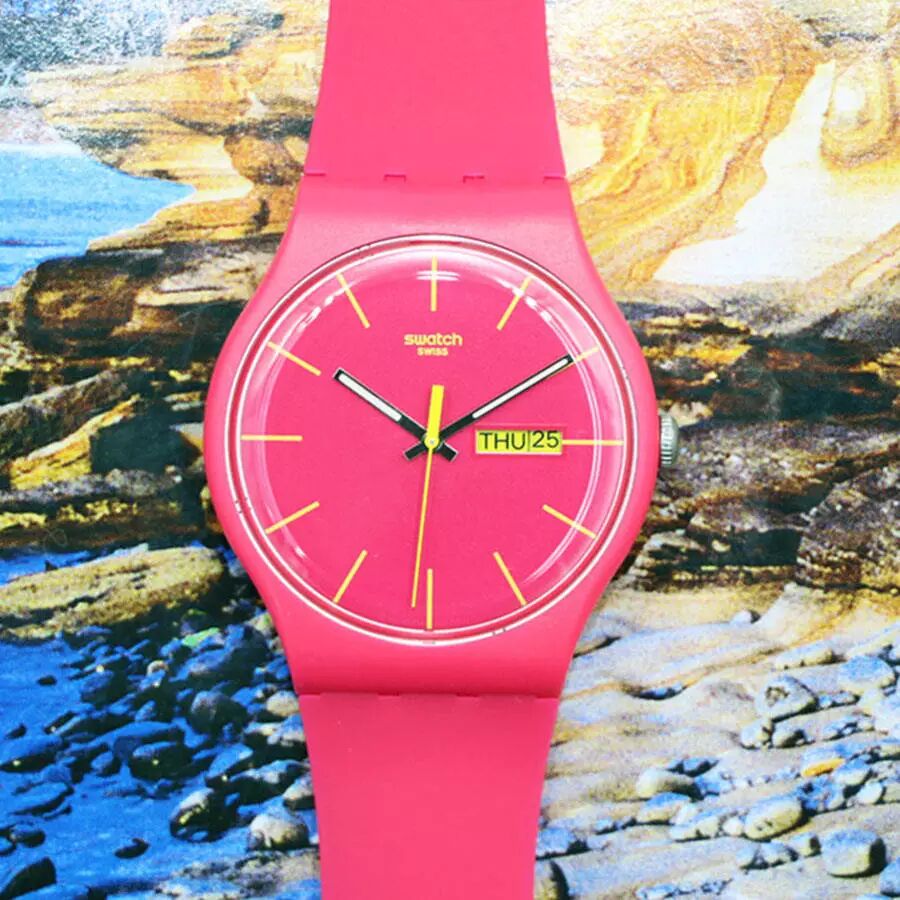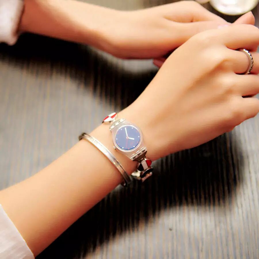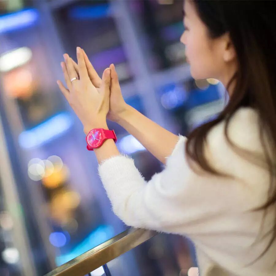 具有swatch特色的树脂材质腕表,石英机芯,轻便舒适,炫彩多色,价格也不贵,是最适合学生党佩戴的时尚手表之一。