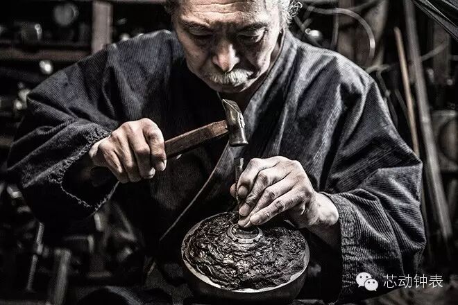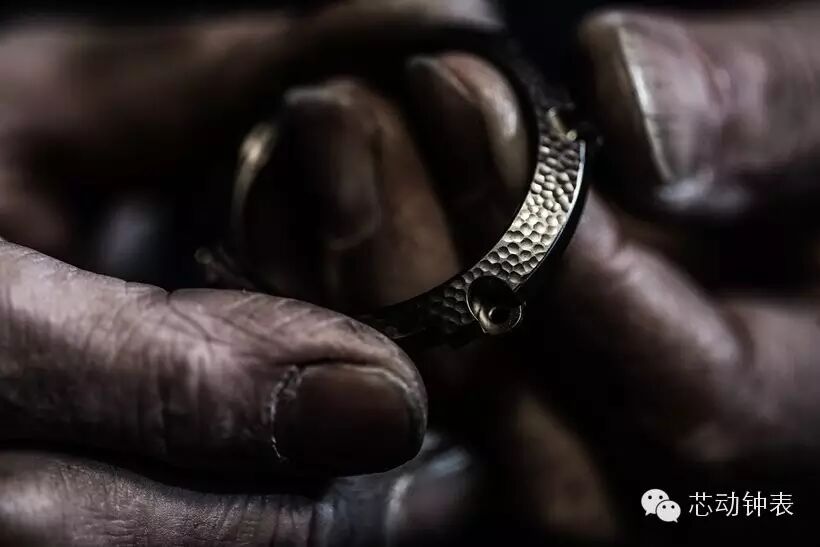 最特殊的地方还是,表壳采用了特殊的工艺——tsuiki,将金属表壳锤击出装饰花纹。其名称Hammer Tone也是取至“锤音”的意思。这个工艺听起来很牛逼,不过我去问了一下,其实并不复杂。