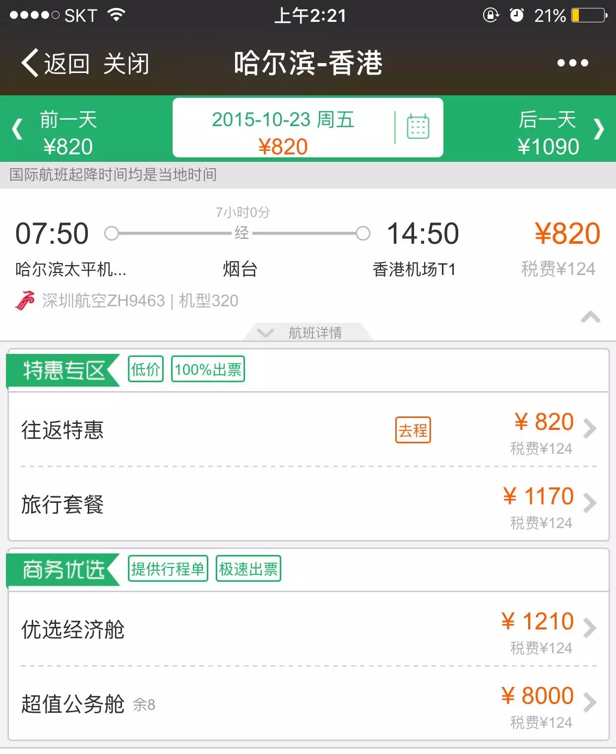 7:50从哈尔滨起飞,10:00抵达烟台,11:40从烟台起飞,14:50抵达香港;