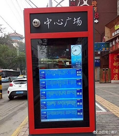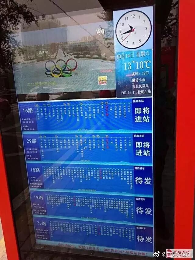 公交车电子路牌上不仅有途经本站的各路公交最近路况信息,还有供乘客掌握时间的电子表、了解当前日期及适时天气温度和Pm2.5值等信息。