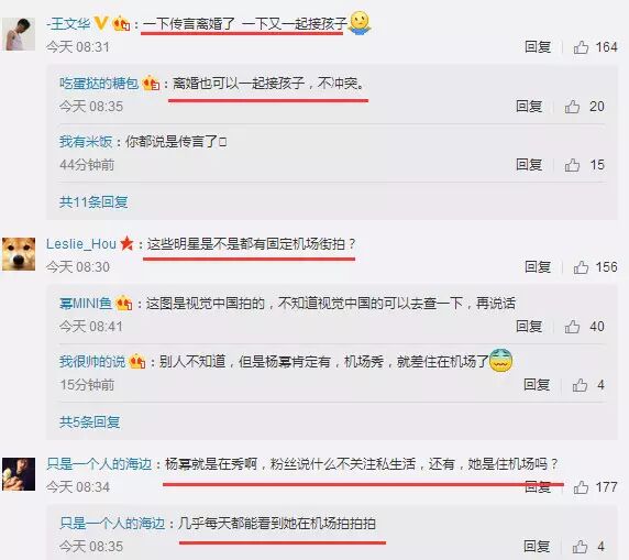 还有一些网友不怀好意地说:一下传言离婚了,一下又一起接孩子;离婚也可以一起接孩子,不冲突;这些明星是不是都有固定机场街拍?杨幂就是在秀啊,粉丝说什么不关注私生活,还有,她是住机场吗?几乎每天都能看到她在机场拍拍拍。