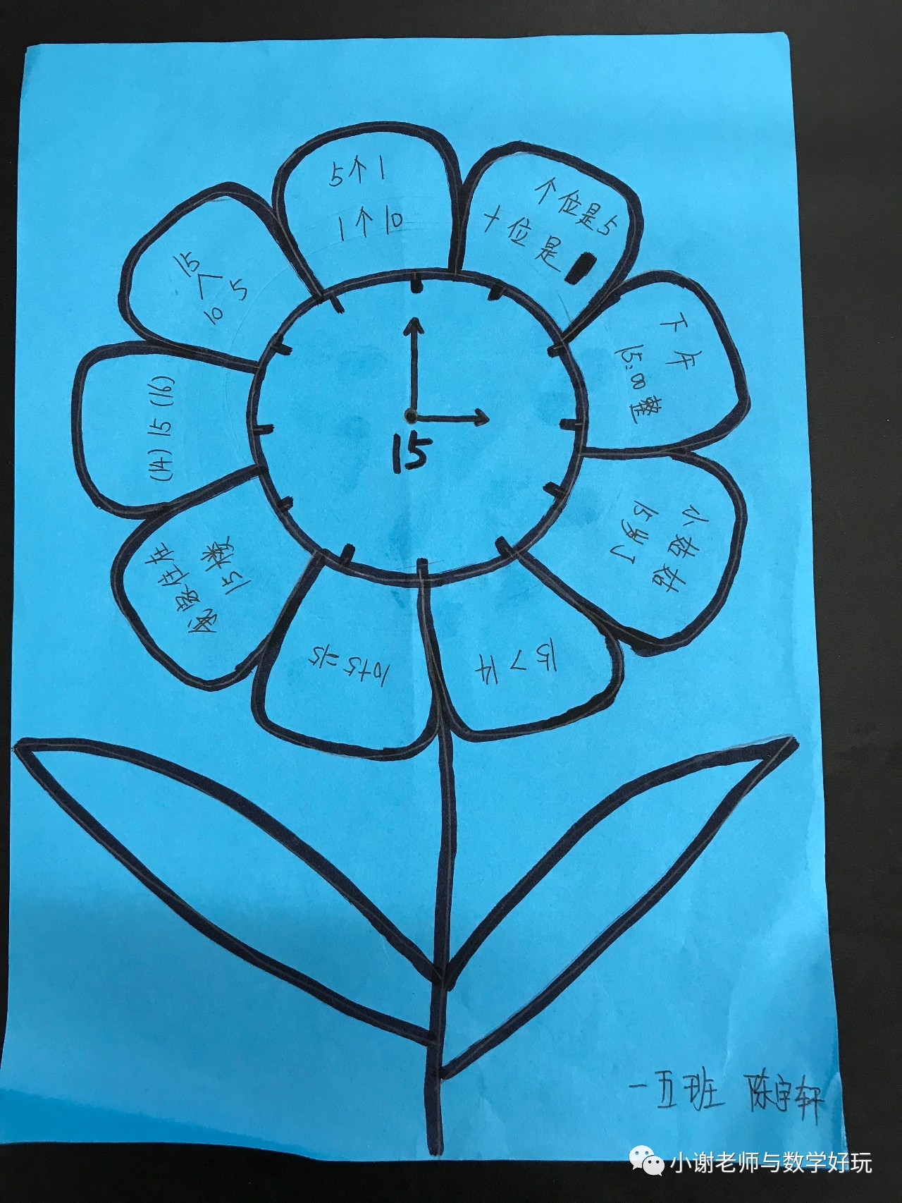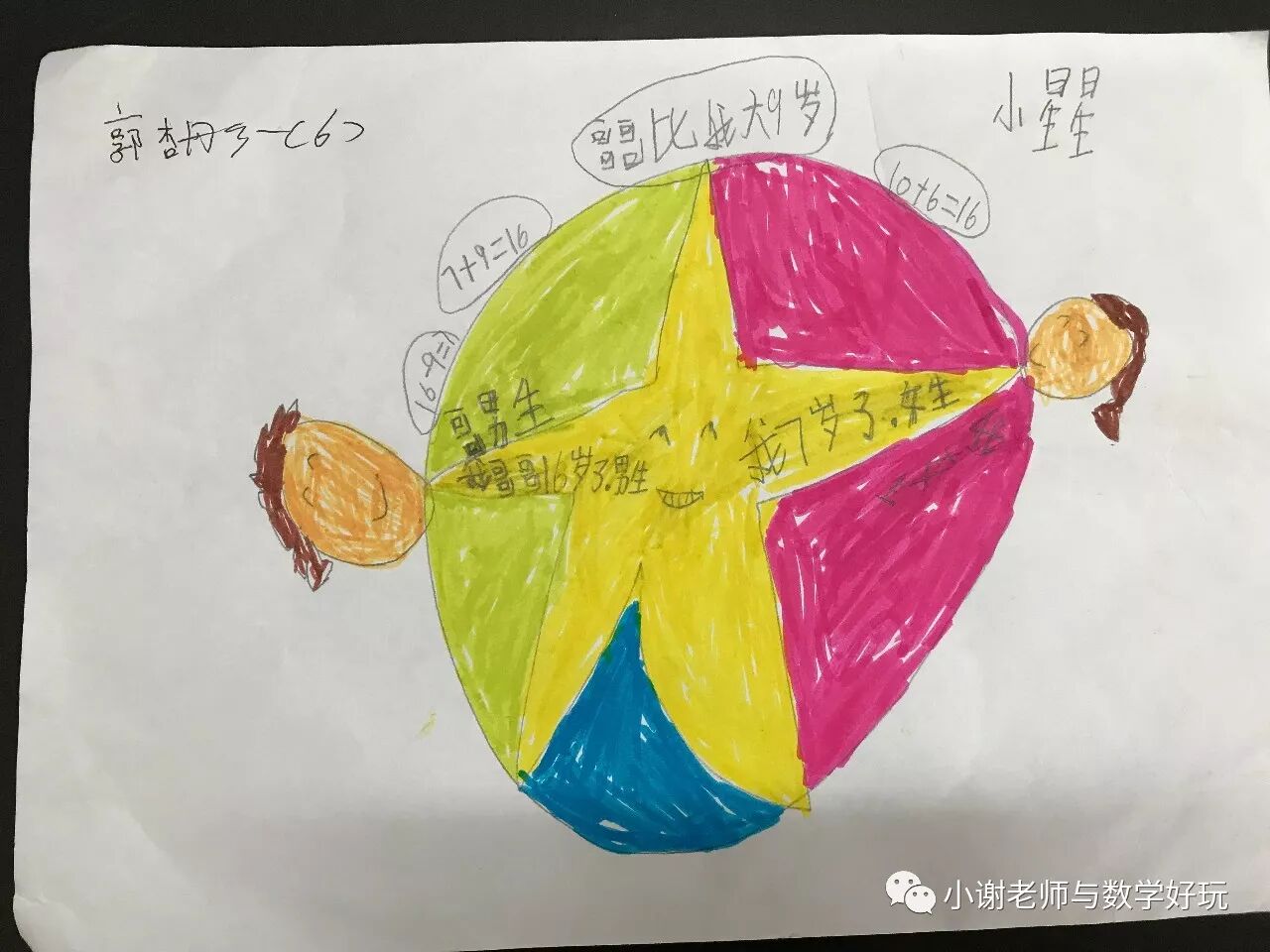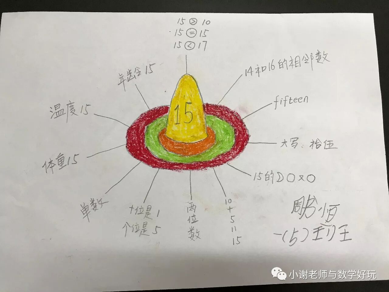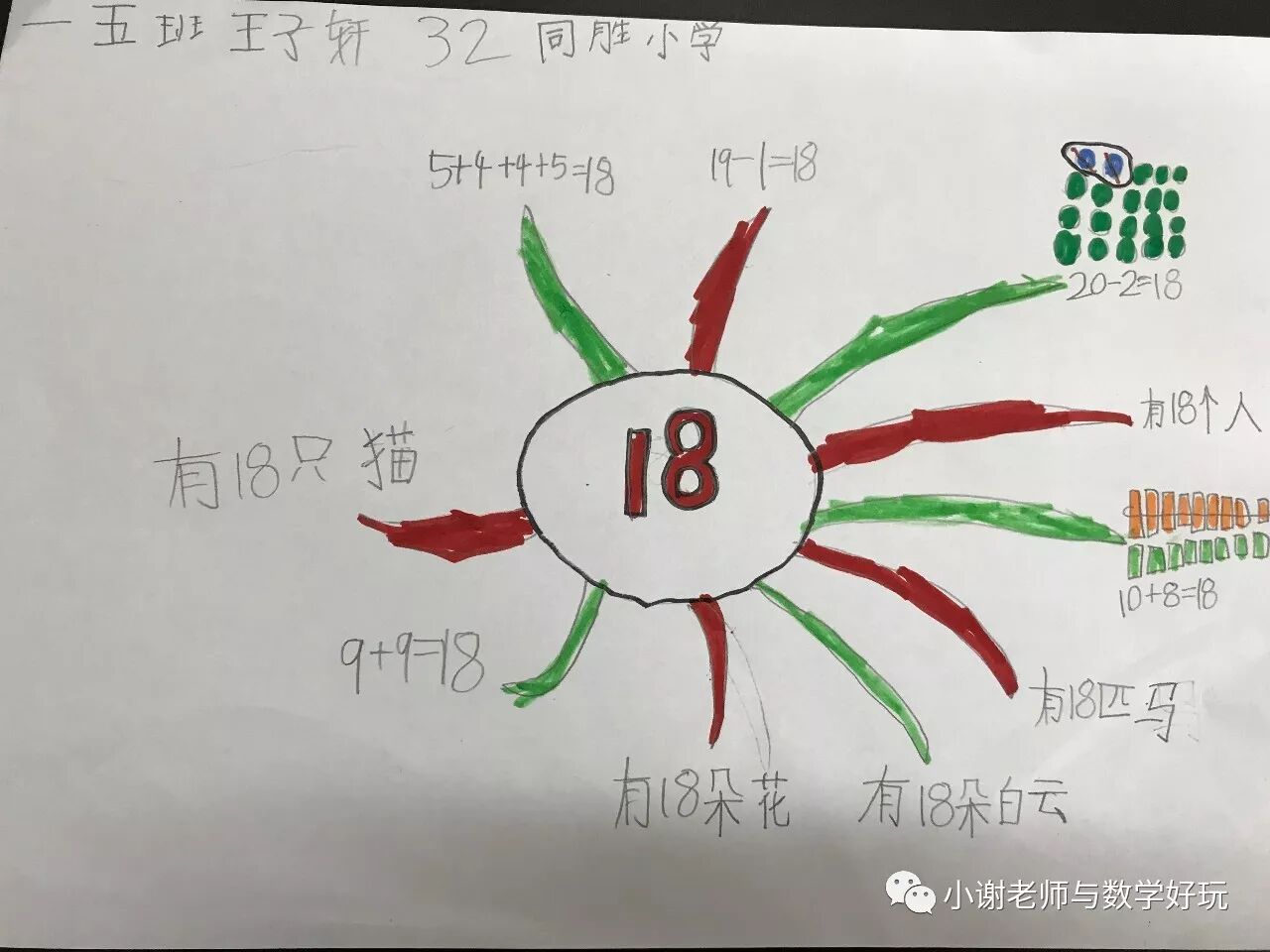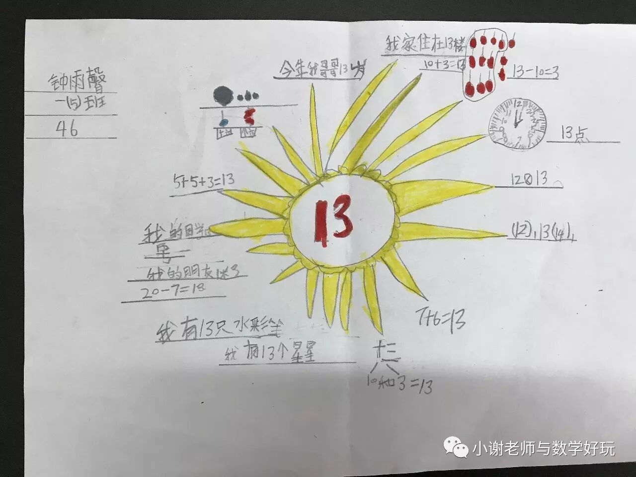我们欣喜地看到,孩子们除了上一篇文章中用到的计数器、小棒、尺子等常用的数学模型来表示数外,还有用到在生活中熟悉的情景之中见过的温度数、湿度数、数字对应的英文单词、体重数、钱币的数量、书的数目、玩具的数量、生肖数、星座数、连加算式、连减算式、乘法算式、除法算式(爸爸妈妈在家提前教的)、数的拆分和合成、时间(电子表时刻、钟面上的24时计时法)、算盘(王子轩小朋友在上一篇文章里面的画上用到了)、体育明星的球衣号码、公交车路线号码、节假日(葛鑫小朋友画上的15的月亮圆又圆)、月份等等来表示十几,丰富了孩子们对20以内数的认识,同时也丰富了学生对数学概念的理解。