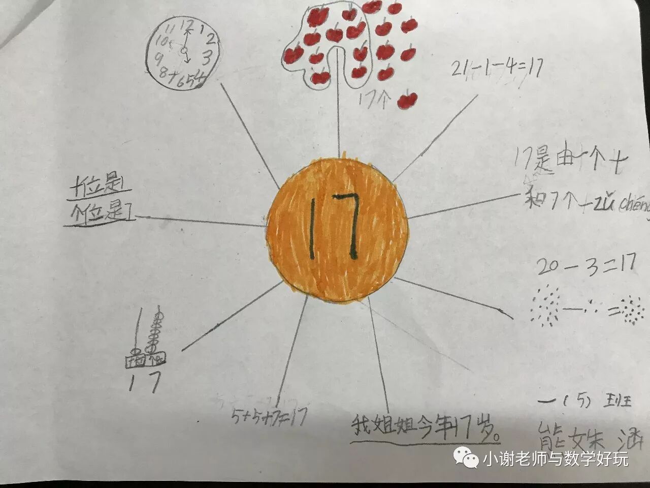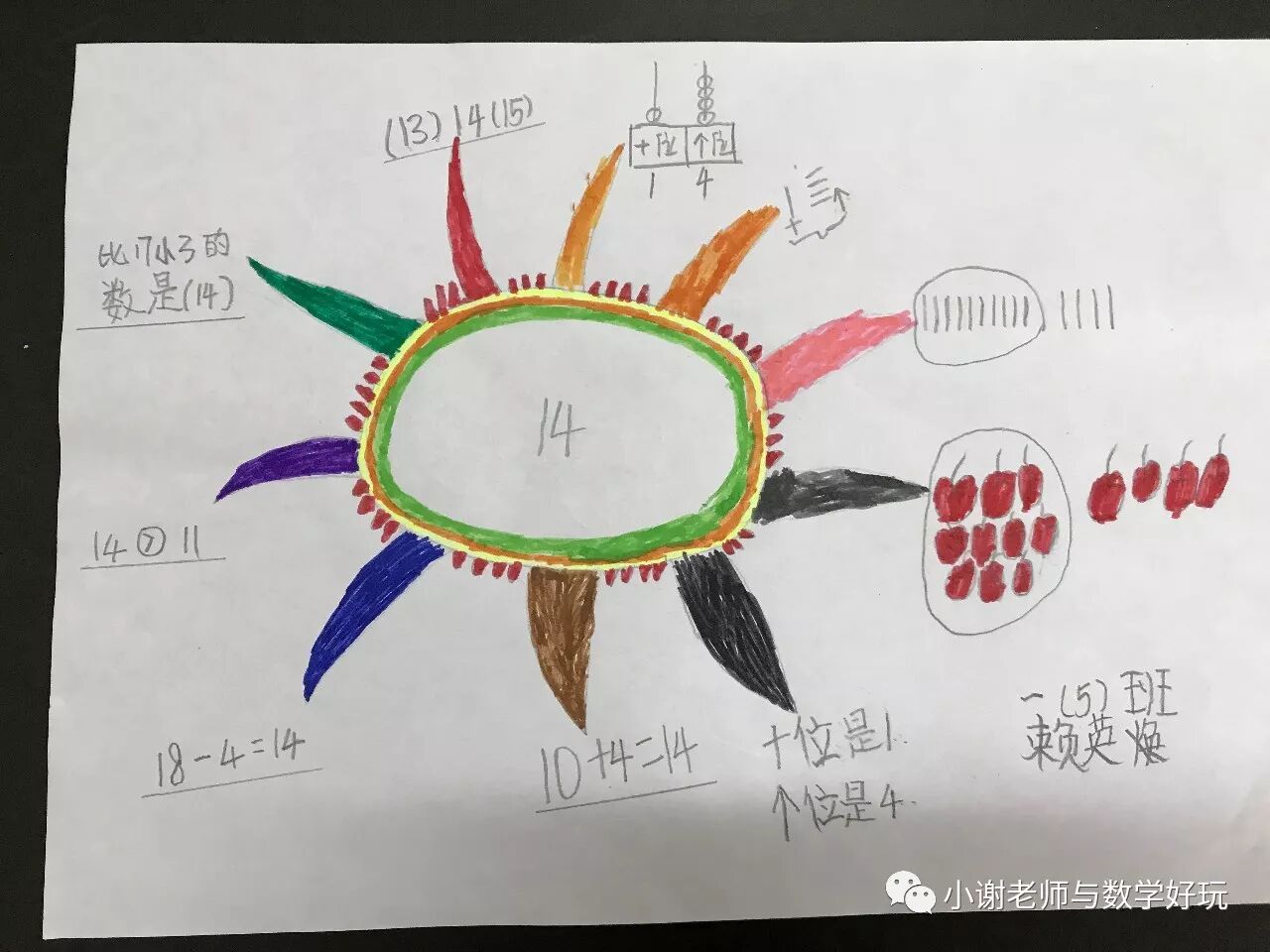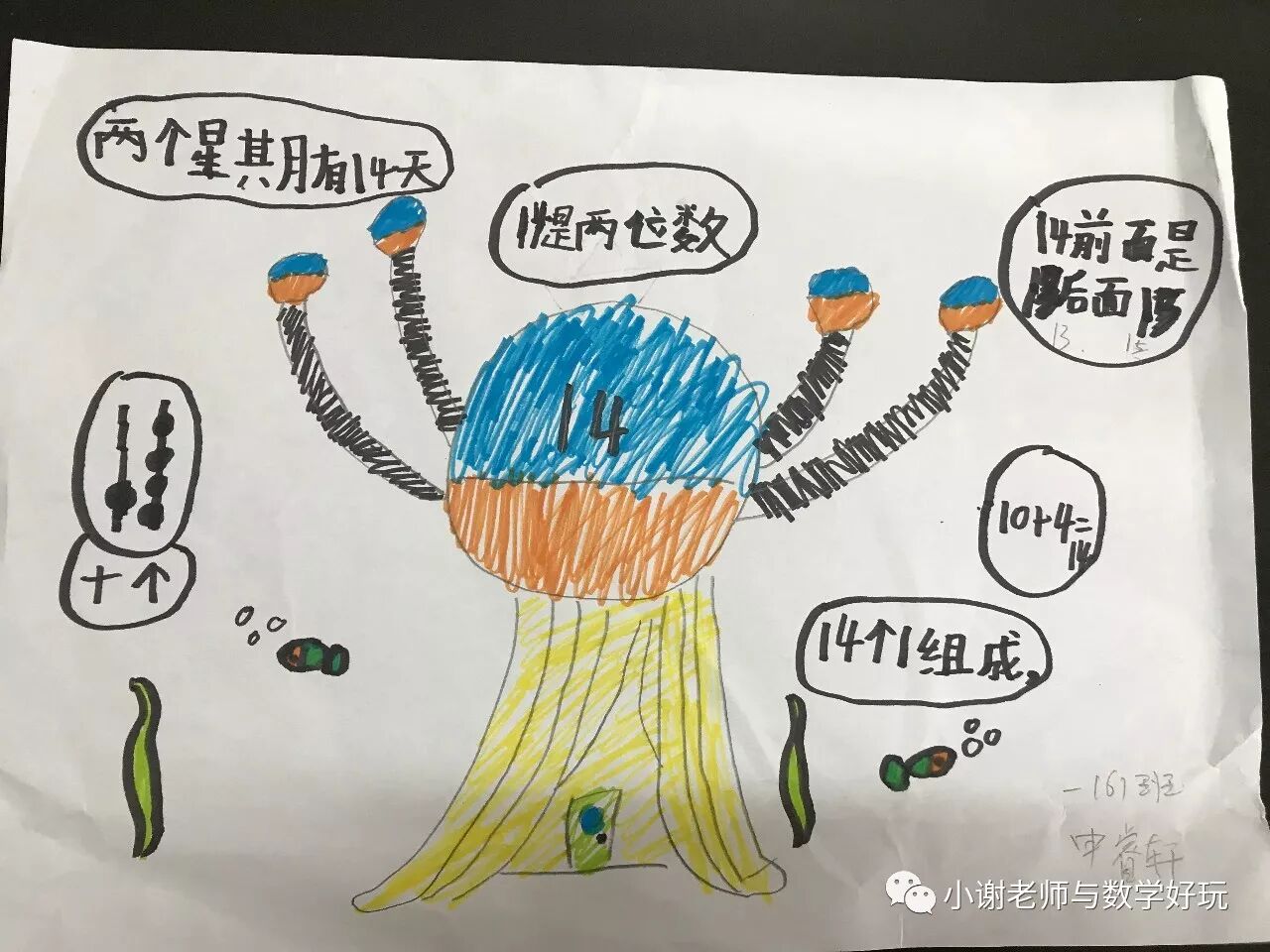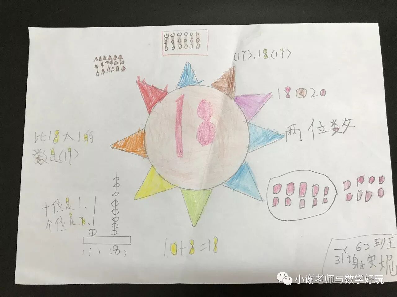 教学最好的方法是演示,在最近发展区的框架内,模仿也有建构的意义。课堂先演示古人的计数方法,数的范围从10以内扩展到了20以内,数多了10个,表示数的符号还是10个,用有限的符号表示无穷的数,真是了不起的发明!再让学生模仿古人,并去画十几的数,这些美到词穷的数字画,体现出了丰富的想象力和好奇心!