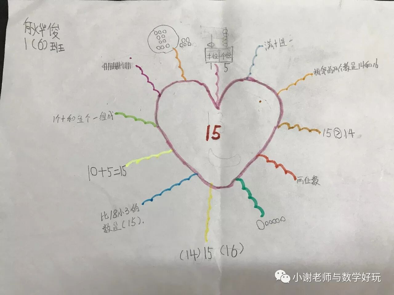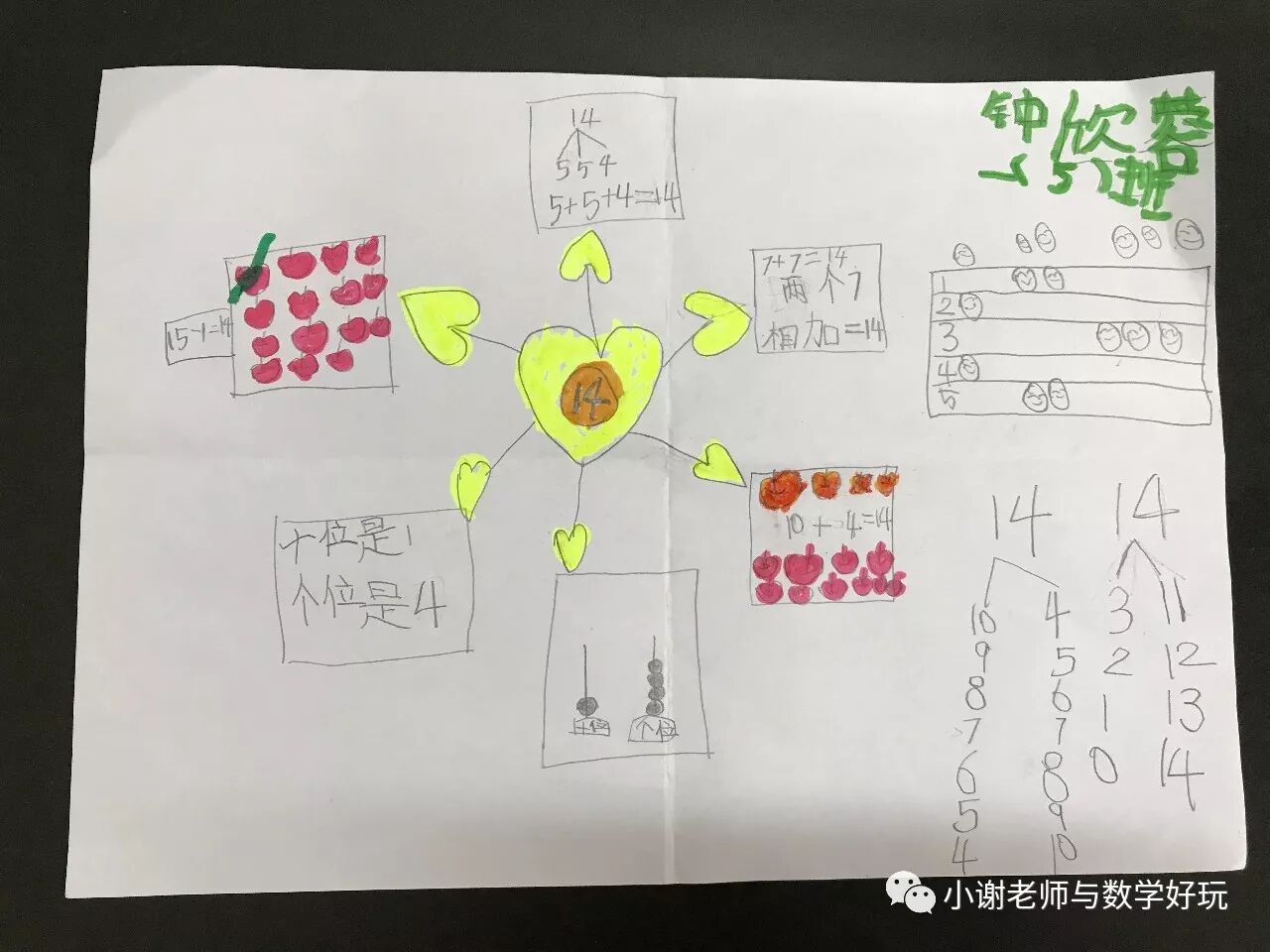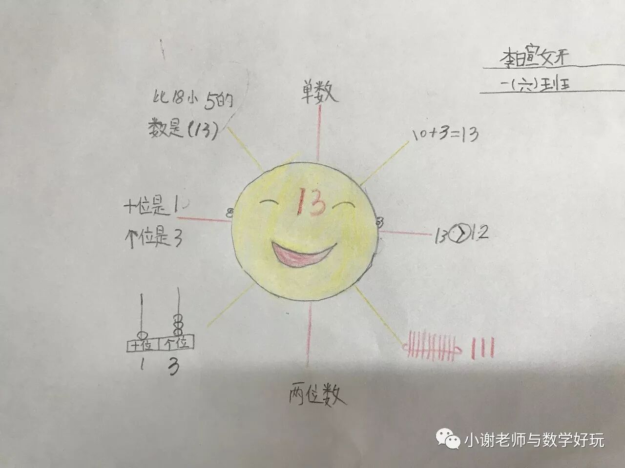 教学最好的方法是演示,在最近发展区的框架内,模仿也有建构的意义。课堂先演示古人的计数方法,数的范围从10以内扩展到了20以内,数多了10个,表示数的符号还是10个,用有限的符号表示无穷的数,真是了不起的发明!再让学生模仿古人,并去画十几的数,这些美到词穷的数字画,体现出了丰富的想象力和好奇心!