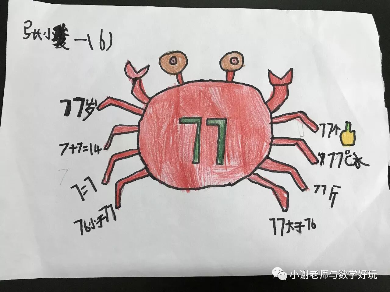 教材告诉我们:古人在没有十进制之前用1个大石子表示1个十,2个小石子表示2个一,合起来就是12。左边的一条横线表示1个十,右边的两条竖线表示2个一,合起来表示12。小朋友们学了这个内容后在家里用自己喜欢的图案或符号或文字等等不同形式设计出来新的表示数的方法,深深体会到了数学创造的乐趣。我们一起来看一下6岁的小宝宝们的数字画。