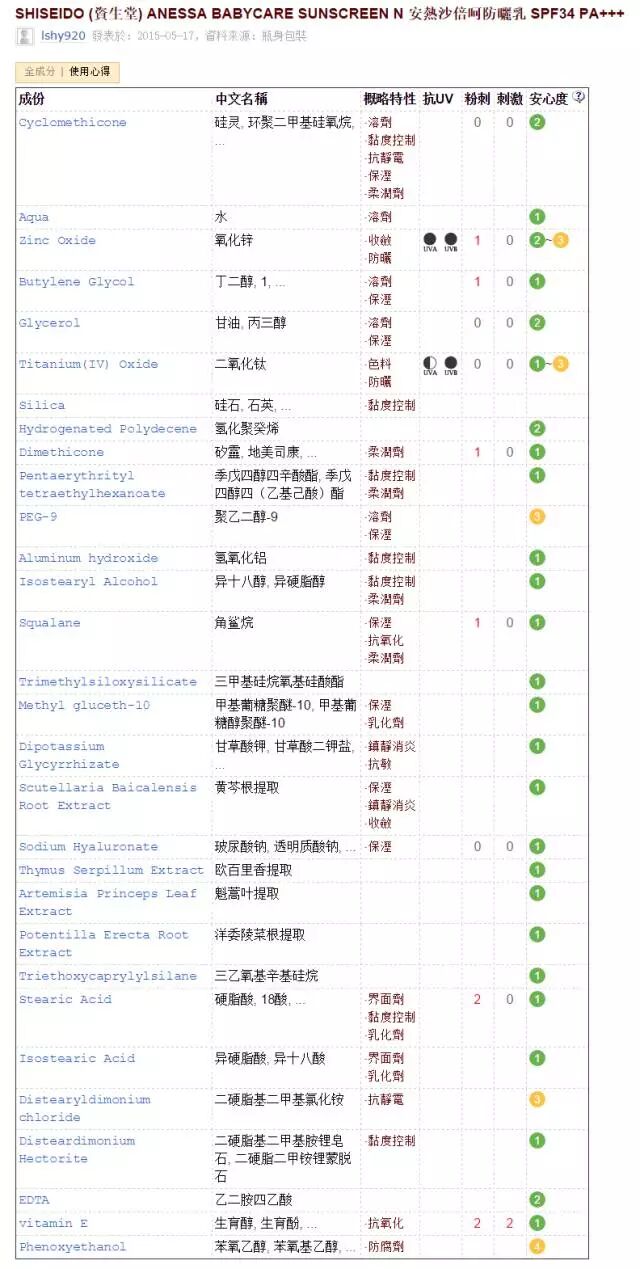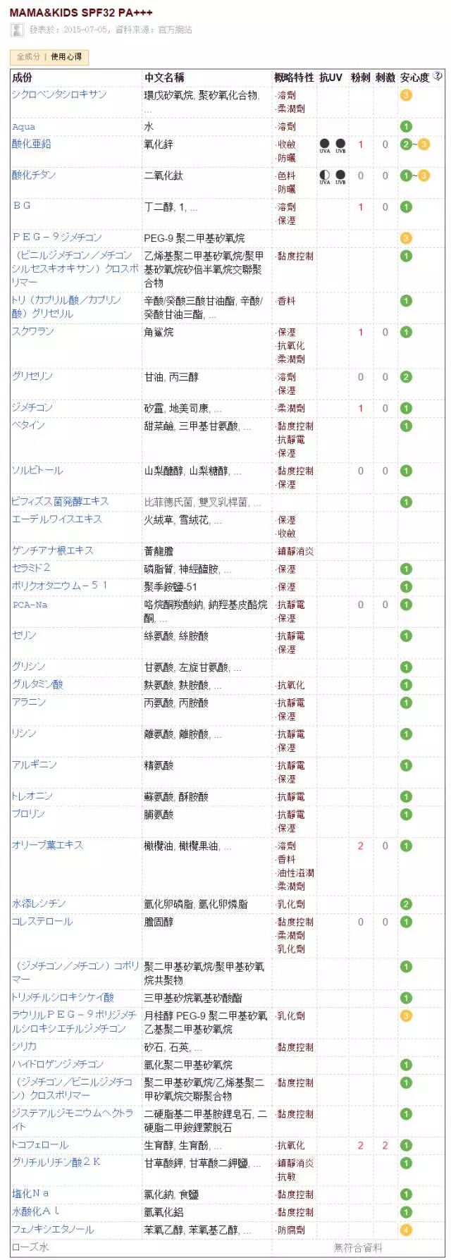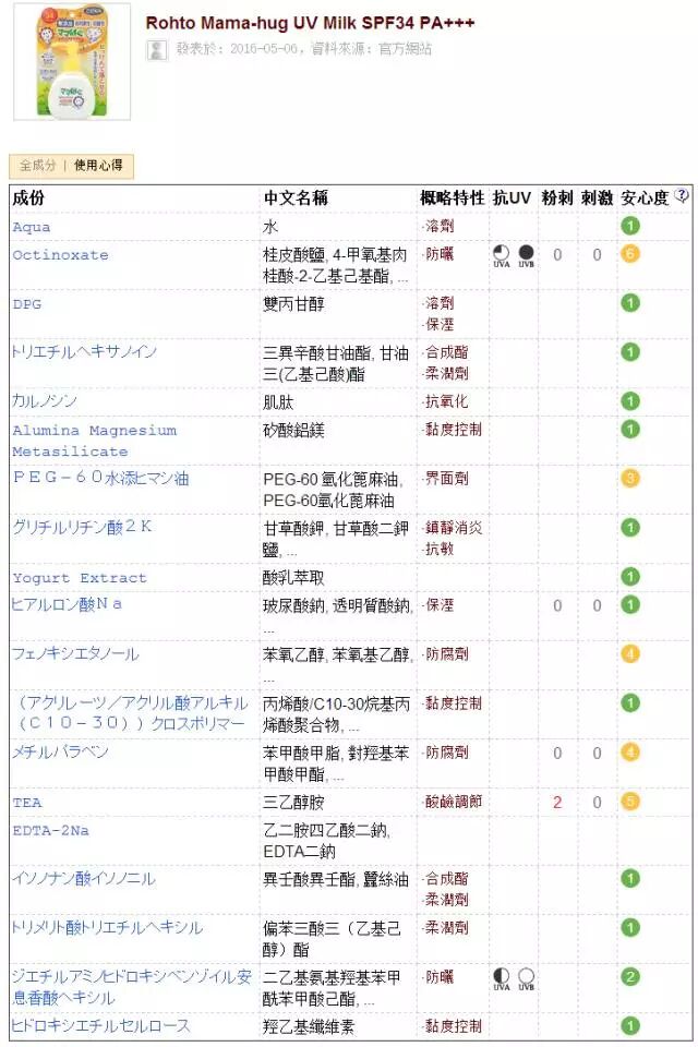 可能有读者要问了,你前面说的这个网站是美国的,上面的产品也是美国的,我如果买了日韩系的宝宝防晒霜,想要看安不安全难道还要自己去找来产品看成分表啊?问题是日文我也看不懂啊!别担心,企鹅爸比介绍给大家另外,介绍给大家一个中文网站“COSDNA化妆品便利信息网”(http://www.cosdna.com/cht/)。这个是台湾的网站,功能和我们之前介绍的EWG差不多,只是他是中文的!你可以在上面查到几乎台湾有卖的所有的各式保养、化妆品成分以及安全性,大家也知道台湾卖的日系产品是很丰富的。在这个网站你可以直接输入产品名称,也可以单一成分查询,不用辛苦的自己一个成分一个成分去找来再输入了!需要注意的一点是,厂商会经常调整产品的成分,网站里的数据有很多不同年份的,在挑选的时候尽量选择最新的数据。COSDNA网站的分级(安心度)没有EWG(0-10分共11级)分得那么细致,它只有分9级(1-9级,数字越小越安心),但它有单独列出刺激性和致粉刺性评分(最高为5级,越大越不好)。另外有的成分没有分级,所以如果不放心可以再搭配EWG查询一下。接下来我们就用这个网站搜一下妈咪群里不少宝妈都喜欢的,来自日本的安热沙倍呵防晒乳SPF34 PA++好了。可以看到安热沙这款防护乳的成分大多数安心指数为绿色的1,其中2个成分落在3,一个落在4(企鹅爸比也在EWG上查了这三款成分的评分,两者是一致的),估计按照EWG打分,总分会是2分,总体来说还算比较安全。美亚评分4.5分。说明消费者的实际使用体验也不错。接下来同样是日本的MAMA&KIDS SPF32 PA+++同样是2个3分,1个4分的,其他大部分为1分,从安全性上来说和安热沙是差不多的。不过日亚有产品没评分,美亚上根本没有这款产品。就听听用过的妈妈怎么说了。 Anita妈妈: 接近液态 抹上去肤色会白一些,整体很清爽,不油腻,吸收也蛮快的!就是在抹防晒之前会抹一层面霜做隔离。 有5个3分,其他也基本是1分,个别是2分。总体来说安全性也是不错的,但比上面2款日系防晒乳略差点。这个就听听企鹅妈咪的试用感受吧! 企鹅妈咪: 除了携带方便外 使用也很方便!按压后有液态乳液出来,粉扑涂更均匀,不会弄到眼睛和嘴巴里!抹完肤色也有一些白,稍油腻一些。企鹅爸比顺手把去年带女儿去冲绳玩的时候在当地买的一瓶乐敦宝宝防晒乳拿出来搜了下。1个6分,1个5分,2个4分,1个3分,看起来不太OK的样子。这款以后不用了,就这么愉快地决定了!知道这个方法以后,碰到日韩系的防晒霜,如果爸爸妈妈吃不准到底成分对宝宝安不安全,都可以去这个网站搜搜看。简直太方便了有没有!!!!!