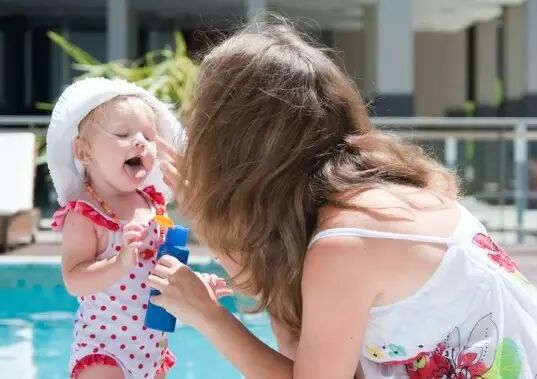 2、涂防晒霜时也要记得注意在孩子鼻头、耳后等特别容易晒伤的地方一定不要漏涂。外出回家后,应用温热水帮孩子把身上、脸上的防晒乳擦洗干净,避免化学成分残留在皮肤表面。