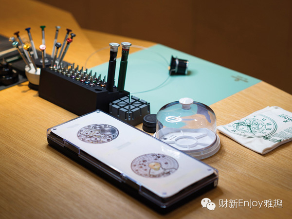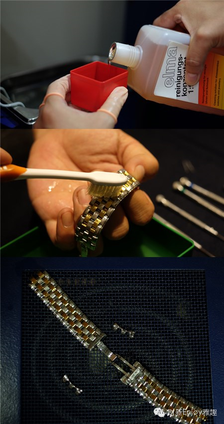 浪琴使用的药水由斯沃琪集团统一购置于瑞士,用一把牙刷,蘸以清水和洗手液就可自行简单清洗,清洗后的表带放在烘干机上烘干
