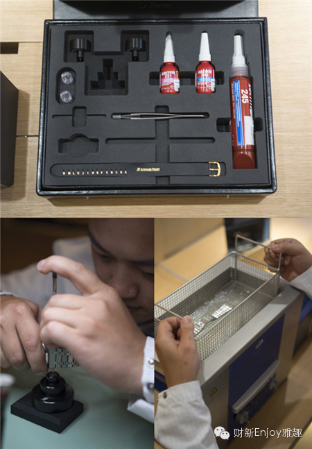 上:专用维护工具箱;下:清洗之前将表带从表头两端拆卸下来,随后放入超声波清洗器中进行 10 分钟左右的加温清洗