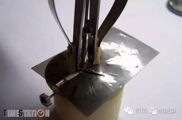 把机芯取出,放在基座上,用起针嵌起针,一定要在表盘上垫上东西,否则划伤了客户的表盘可没法交代了