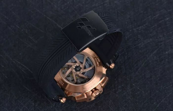 腕表的表壳直径达到了47.25*45毫米,是一只很大的手表,手腕细的话的确很难驾驭。但是对于赛车手来说,它佩戴在赛车服外侧,是完全没问题的。因为与Moto GP合作而推出,表款采用了大量的机车元素,比如计时按钮采用踏板的纹路。表圈采用前后轮刹车碟盘的元素。因为内部搭载了计时功能,配合这个大尺寸表壳,因此它的厚度也不可忽视。