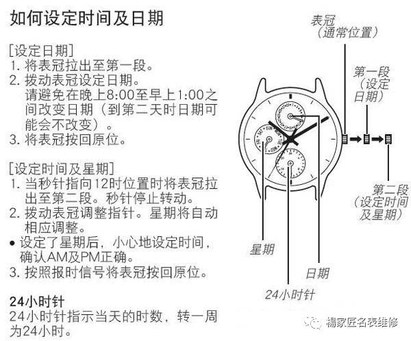 9)手表的款式不同调整的方式也不一样,但在调整带日历功能的手表时都需要考虑上午和下午的因素。