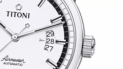 3点位置的星期日历窗口清晰显眼,亮银色的指针在镀银白的表盘上显得十分和谐。更为惹人注目的应该是它特别的计时按钮,带有明显的上世纪60年代意大利跑车驾驶舱的元素,双面防反光凸状蓝宝石表镜使手表看起来更有大牌品质。