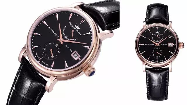 如果你的合伙人是个年轻有为的小伙子,那我建议你可以送一枚颜值超高但价格又十分良心的雍加毕索。这款腕表的表盘采用了漆黑的底色和内尖式立体刻度,金色的指针与刻度相对而立,配备清晰的夜光刻度。