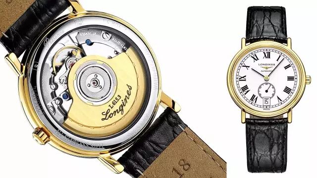 表款使用的L615自动上链机械机芯,每小时振动28,800次,提供42小时动力储存,拥有单独的小秒盘和单日历显示。透底设计能够方便佩戴者随时观赏镀金的自动摆陀的运动轨迹,摆陀上除了打造甲板纹还刻上了浪琴的名称和机芯的型号。
