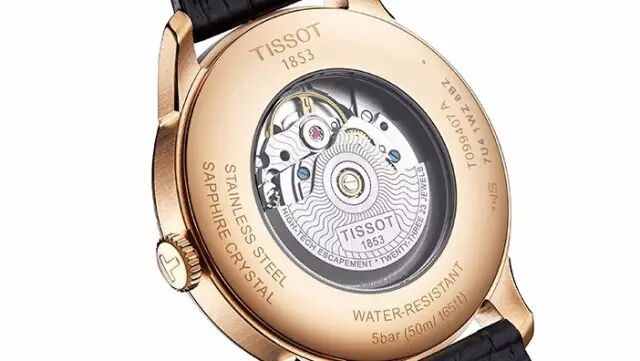 表盘上镶贴了金色的罗马时标,时标下则是打造了排列整齐的巴黎钉纹饰,加上深棕色的真皮表带,是一款非常典型的带有当代风格设计的天梭腕表。