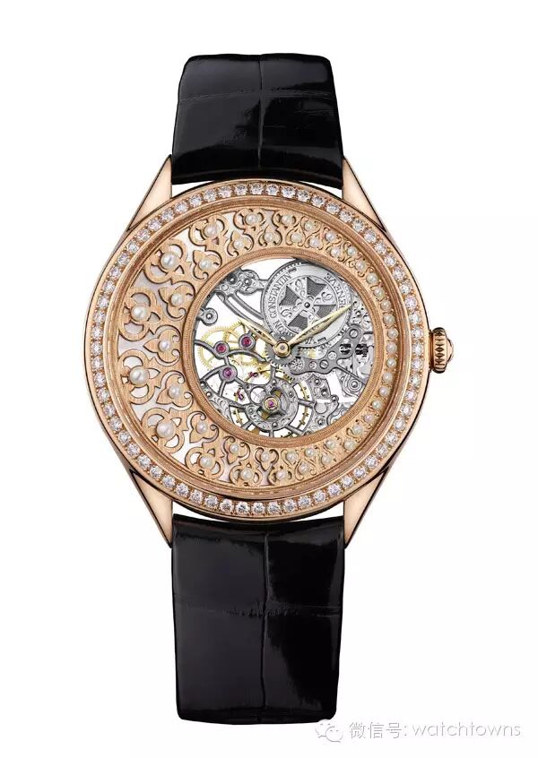 再来看看这枚价值更加不菲的江诗丹顿艺术大师系列奥斯曼建筑主题腕33580/000R-9906,镂空感源于精美的倒角处理,采用倒角处理的粉红金木结构窗格表盘清晰地呈现出精密复杂的纤巧机芯,几乎每一条边都经过细致的手工倒角处理。镶嵌着珍珠粒的金质窗格图案置于白色天然珍珠贝母基底上。手动机械机芯,18k玫瑰金材质,镶85颗钻石,表径37毫米,防水30米,限量20枚。