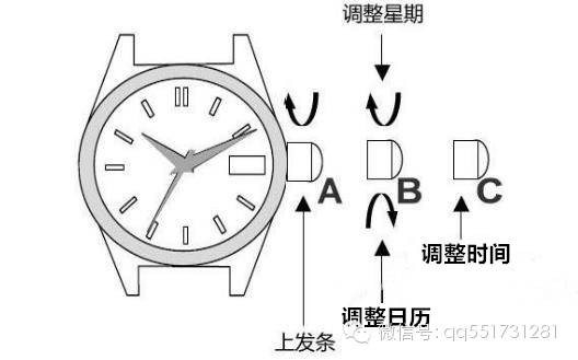 上发条:表冠处A位置,顺时针旋转表冠,有磁磁的声音,有阻力的感觉即为上发条,通常旋转30圈左右即视为上满。建议,在调整完时间后再上发条。这里要注意的是,自动机械手表不同于收到机械手表,即使上满弦也不会有紧的感觉,因为其中有打滑装置,会将多上的弦释放,以此来达到保护机芯的目的。