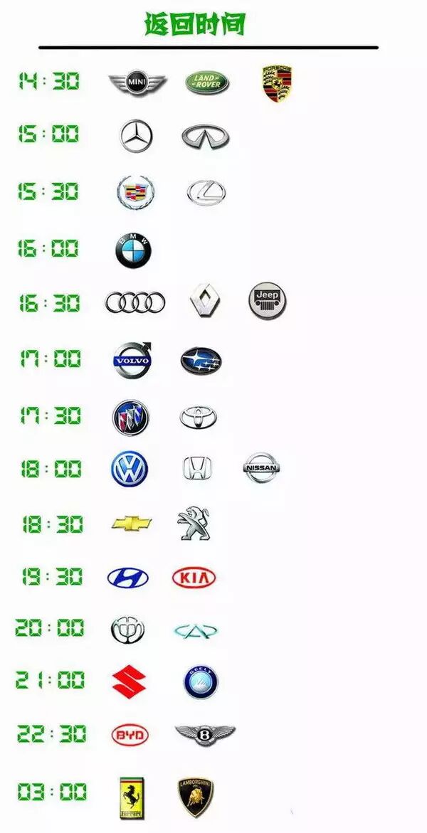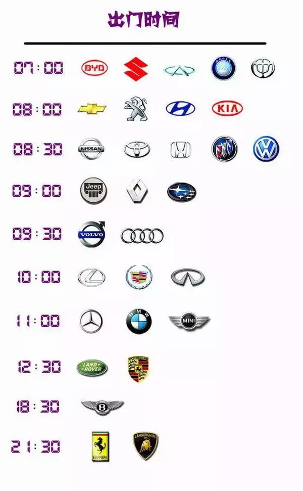 据传,某位咸得蛋疼的“仁兄”,扎实研究了一下自己所在小区不同品牌汽车车主的出入时间,并细心整理作息表如下: