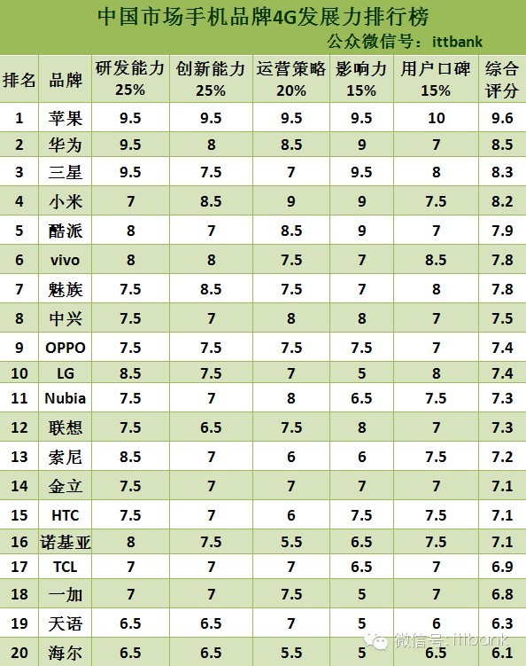 中国市场手机品牌4G发展力排行榜具体的评价标准分为研发能力、创新能力、运营能力、影响力和用户口碑五个维度,评分权重分别为25%、25%、20%、15%和15%。本次排行我们更为看重品牌的技术能力和研发能力,而较为弱化影响力和用户口碑,这是因为影响力和用户口碑更多是代表企业的现在状态,而技术能力和创新能力则更多代表着企业的未来。