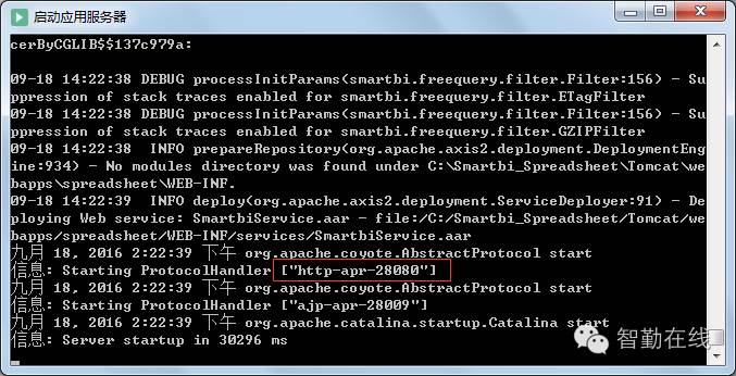 关闭应用服务器窗口(即Tomcat的命令窗口),并重新点击开始菜单->所有程序->Smartbi Spreadsheet->启动应用服务器,等待出现 http-apr-28080 信息,并显示 server startup in xxxx ms 信息。