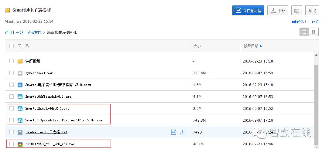 在百度网盘中,选择下载SmartbiExcelAddin、Smartbi Spreadsheet Edition、dotNetFx40_Full_x86_x64等3个软件