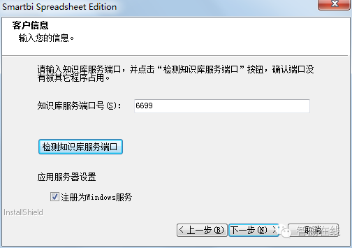 默认将安装 Mysql 数据库作为知识库存储所有元数据信息,Mysql服务占用的端口号默认是6699,点击【检测知识库服务端口】检测6699端口是否被占用,如果被占用,请输入其他端口号。选中【注册为windows服务】,点击【下一步】运行。