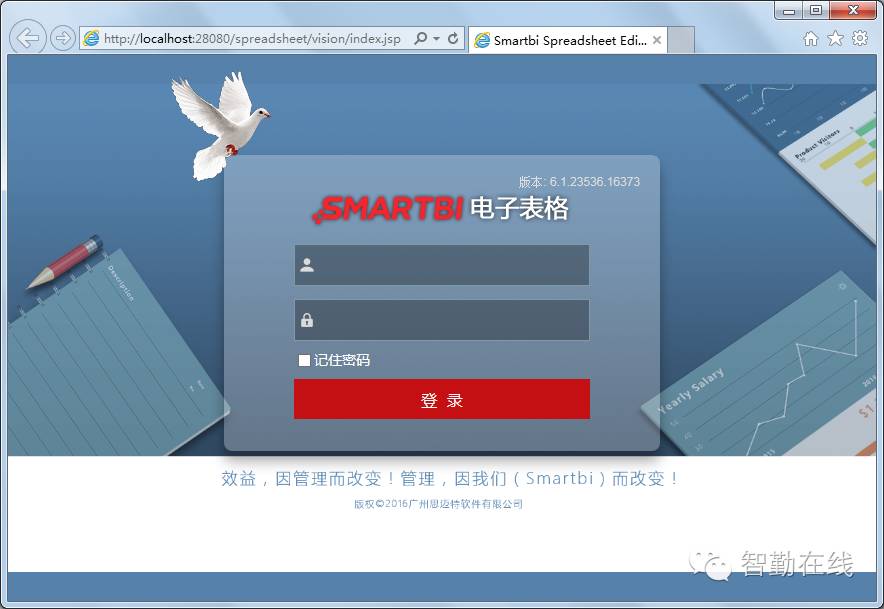 关于访问:在启动了Smartbi电子表格的应用服务器即Tomcat以后,打开浏览器,直接输入http://localhost:28080/spreadsheet,如果电子表格服务端组件部署服务器上,将localhost替换为服务器的IP地址。