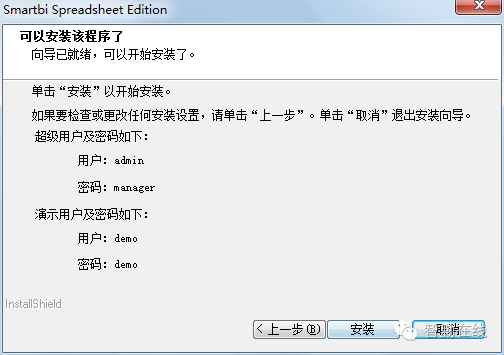 安装已就绪,记住管理员账户和系统演示用户,点击【安装】运行安装。