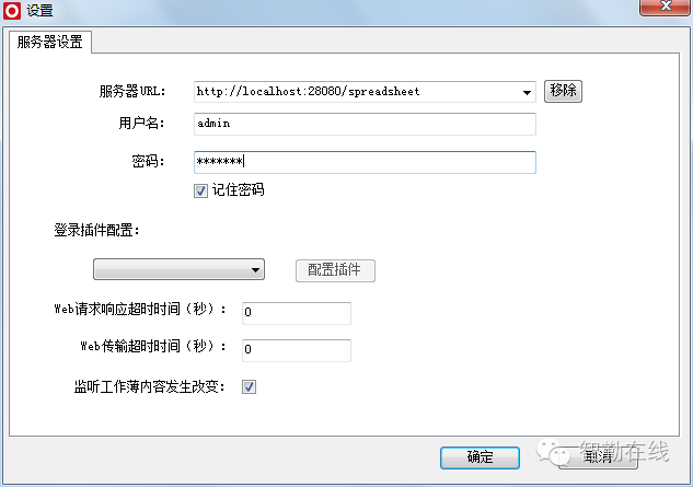 在服务器URL中输入http://localhost:28080/spreadsheet,将用户名设置为admin,密码设置为manager,并点击【确定】。