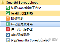 测试安装是否成功,开始菜单->所有程序->Smartbi Spreadsheet->启动应用服务器。