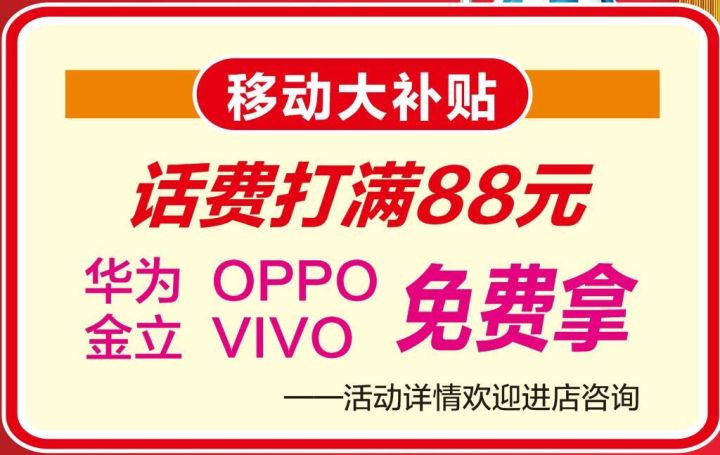 话费打满88元,华为、OPPO、金立、vivo免费拿。