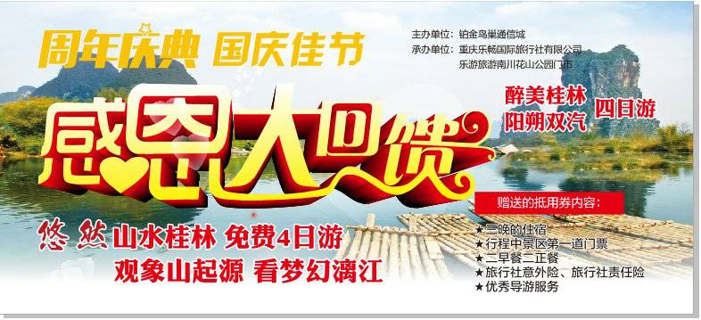 10月1-10月7日(上午9-12点下午14-18点),中国移动南川第1手机城一铂金鸟巢移动通信城周年大庆,国庆佳节!漓江泛舟看大美桂林免费4日游,桂林山水甲天下,绝妙漓江秋泛游