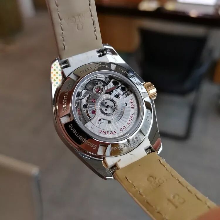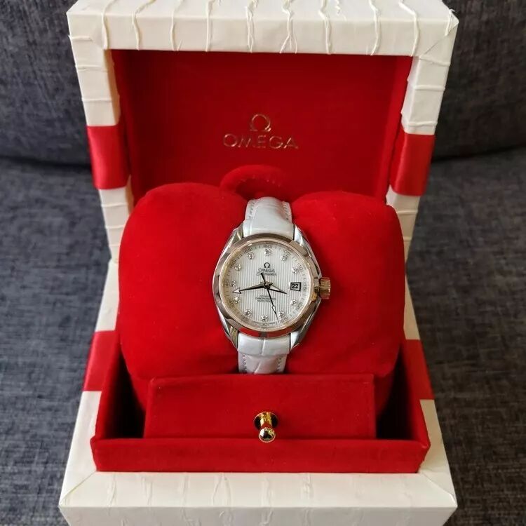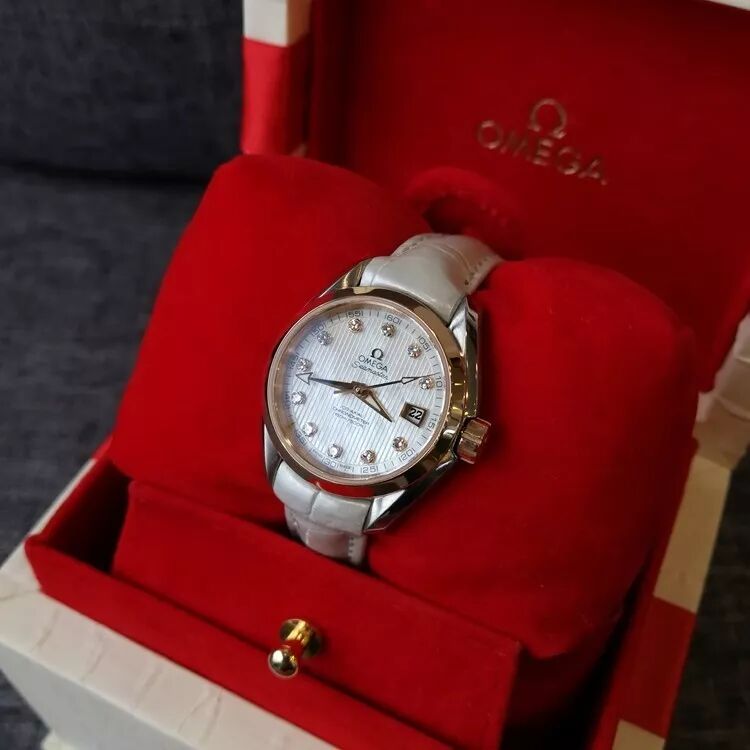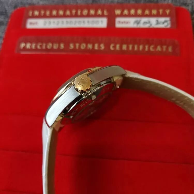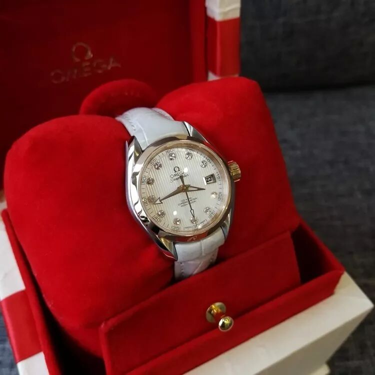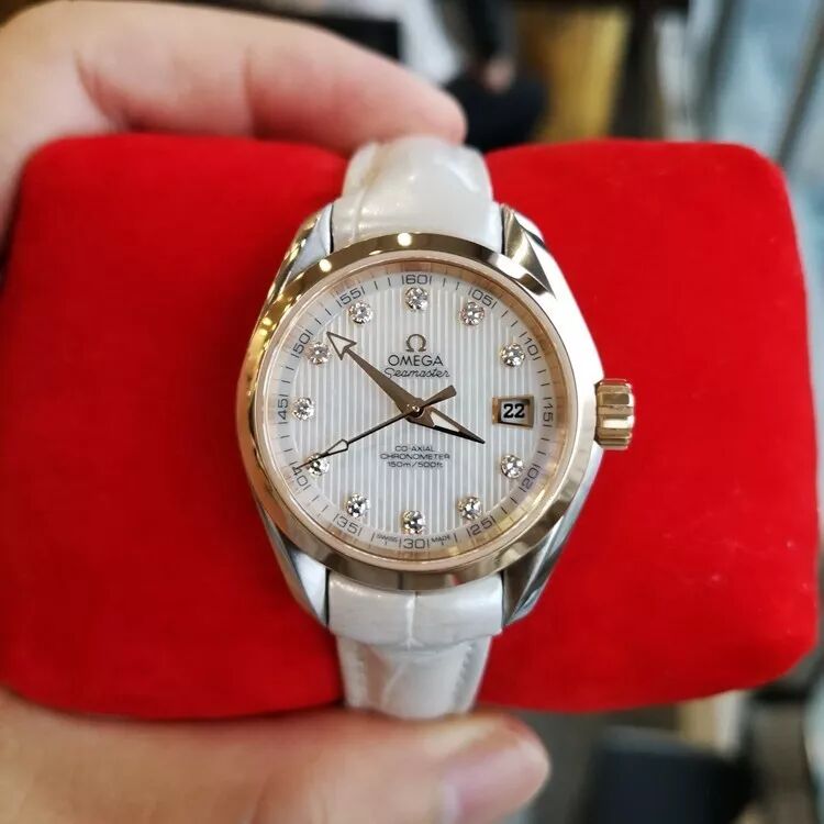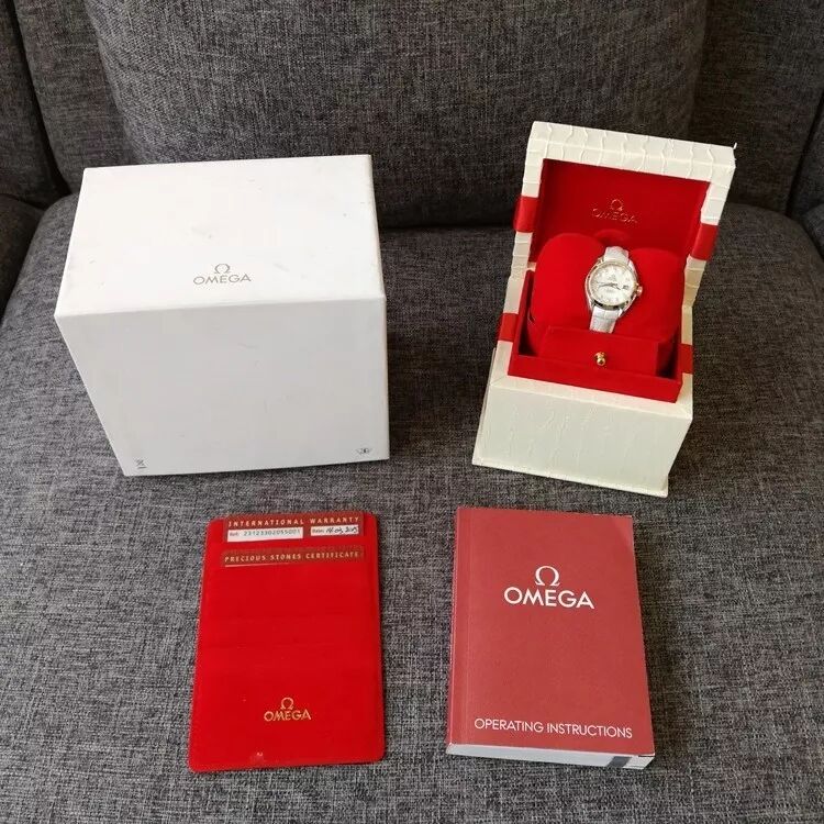 手表成色98新,保卡,说明书包装盒齐全。30毫米表径,采用欧米茄8520机械机芯,走时精准稳定,18K红金表圈和表冠,钻石时标