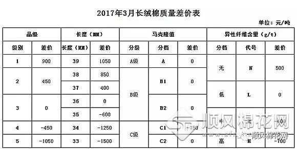 根据2016年9月-2017年2月我国公检棉花质量情况、2017年2月中国棉花价格指数变动情况和纺织企业监测点的采集数据,与上月相比,本月对《锯齿加工细绒棉质量差价表》做出以下调整: