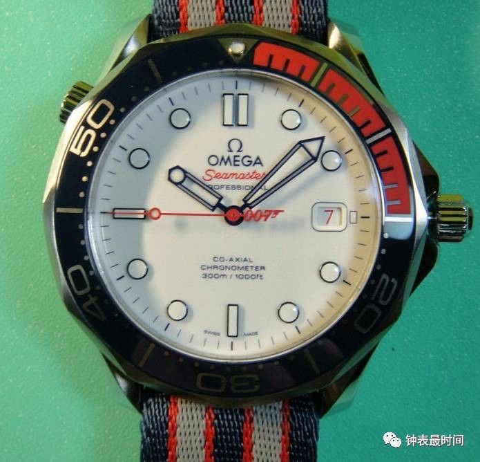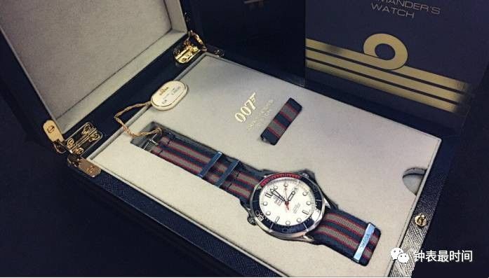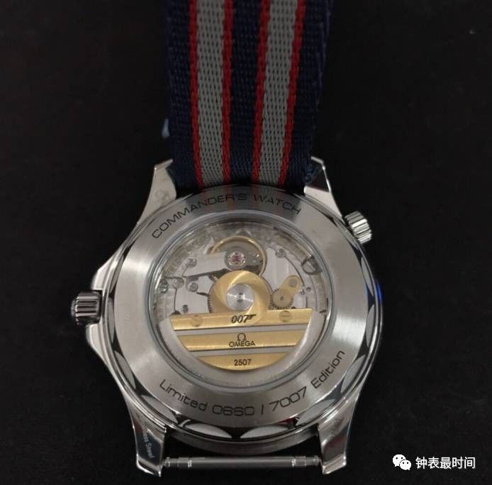 此款表还有一个特色的地方是,选用蓝、红、灰相间的5条纹“NATO”北约军用尼龙表带,搭配抛光表扣。手表的背面采用了波纹边缘设计,摆陀上饰有英国皇家海军中校军衔徽章的“三道杠”图案,以及007的“子弹”标识,非常的个性十足。