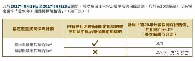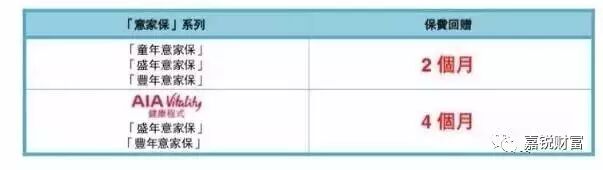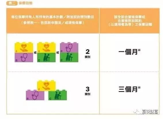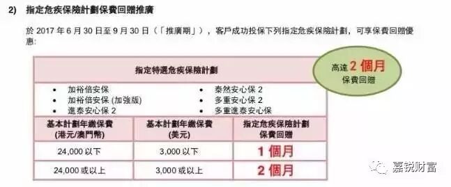 于2017年5月29日至2017年8月25日期间,成功投保表一之指定全新医疗及保障基本计划及/或附加契约,并符合表二之持有保单类别数目要求(包括新申请及/或现有保单),每份全新合资格保单/合资格附加契约即有机会获享高达三个月保费回赠!